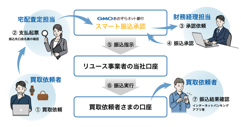 従来の買取サービスでは、店頭での現金受け渡しの取引が主流でしたが、コロナ禍によって、宅配・オンライン買取のニーズが高まり、銀行振込による取引が急増しています。しかし、買取依頼者の本人確認結果や商品の査定結果などを登録・管理するリユース事業者のシステムは、振込での取引を前提に構築されたものではないケースが多く、振込データの作成や支払実行にかかる社内承認などの業務の効率化は目下の課題となっております。