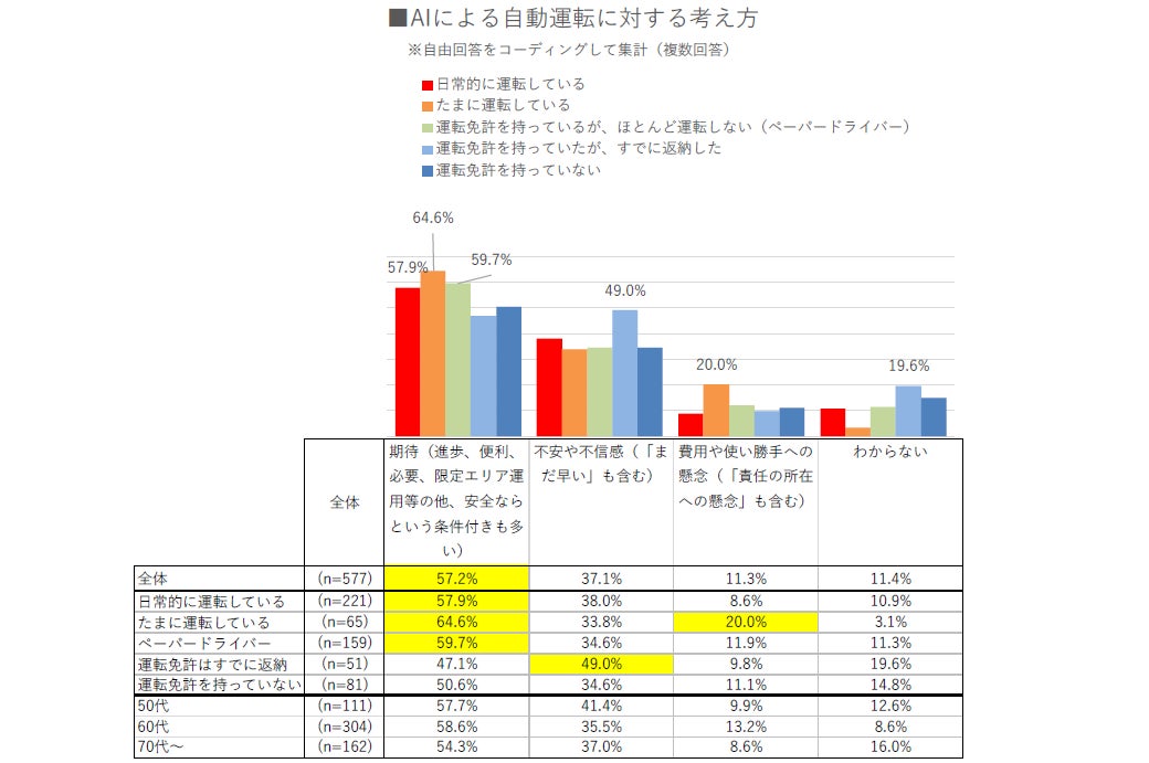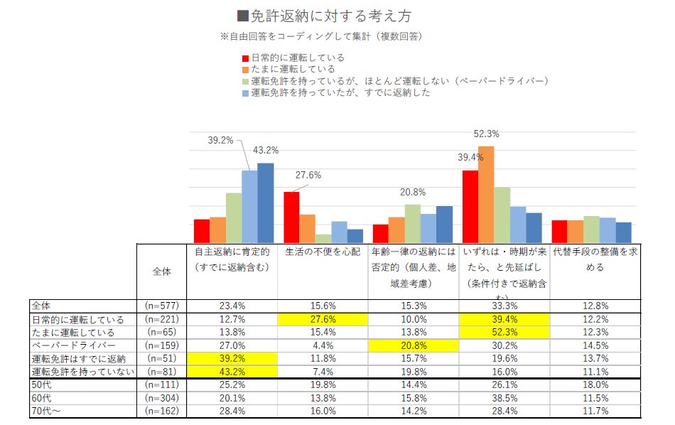 自由回答では「年齢が高いからというだけの理由で返納するのは生活の質や認知機能の低下を招く」などの意見が見られた。