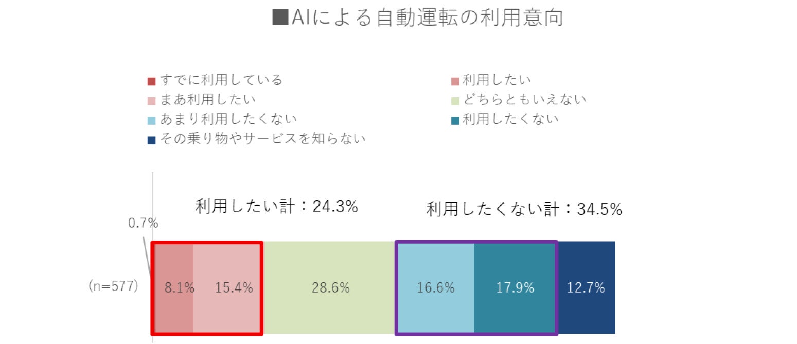 「AIによる自動運転」の利用意向(すでに利用している+利用したい+まあ利用したい)は24.3%。利用したくない(利用したくない+あまり利用したくない)は34.5%で「利用したくない」がやや上回った。