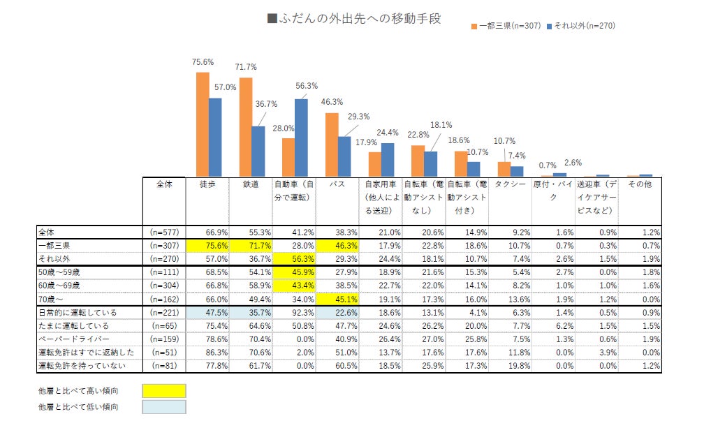 普段の外出先への移動手段は居住地域によって差が大きく、一都三県では「徒歩」「バス」「鉄道」利用率がそれ以外の地域を大きく上回る。特に鉄道は一都三県以外の地域の約2倍。