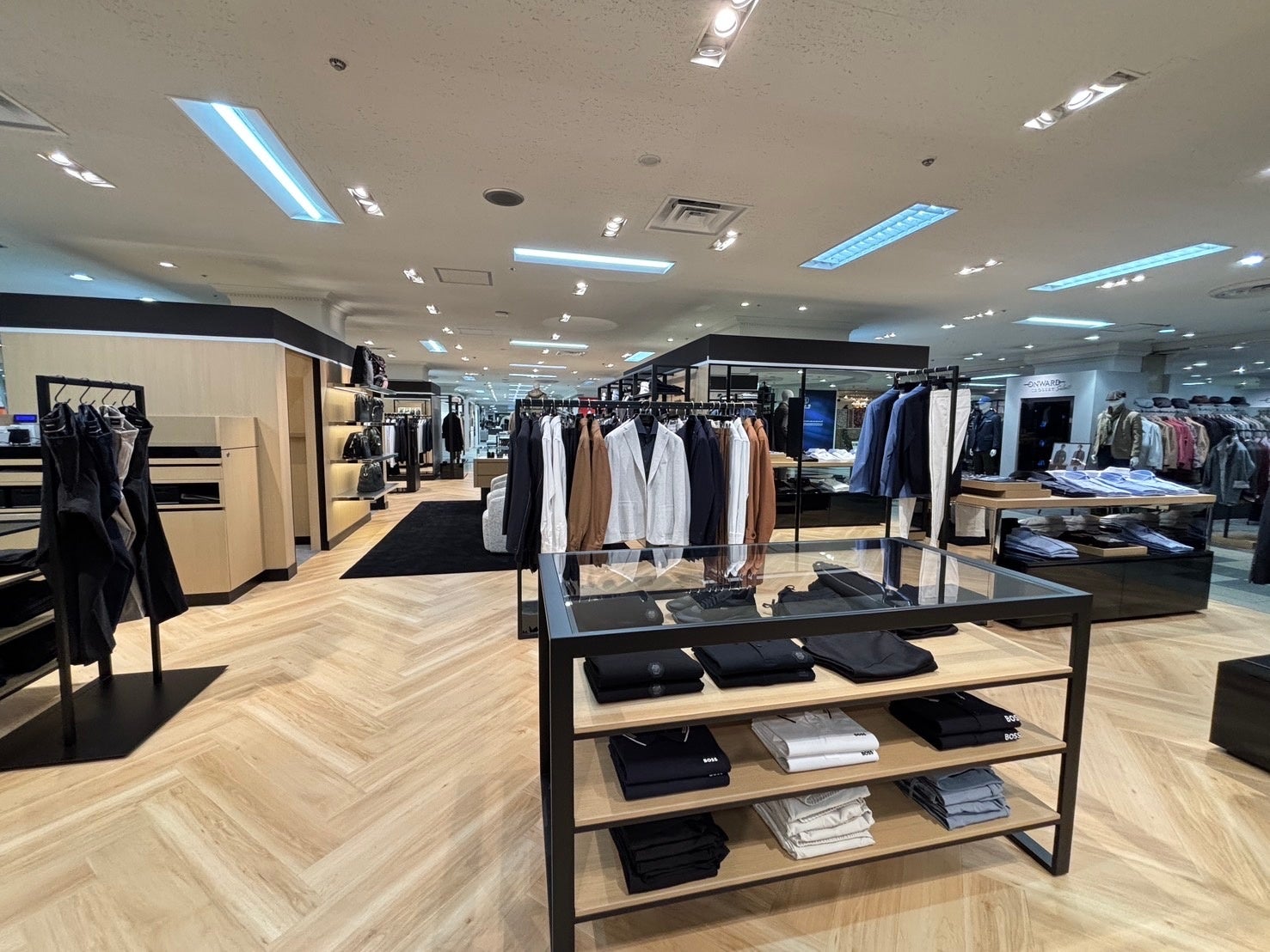 店舗面積149㎡のこの空間は、ビジネスシーンに相応しい装いやスポーツライン、日常を彩るカジュアルスタイル、そしてサングラスや香水まで多数取り揃えたメンズウェアショップです。