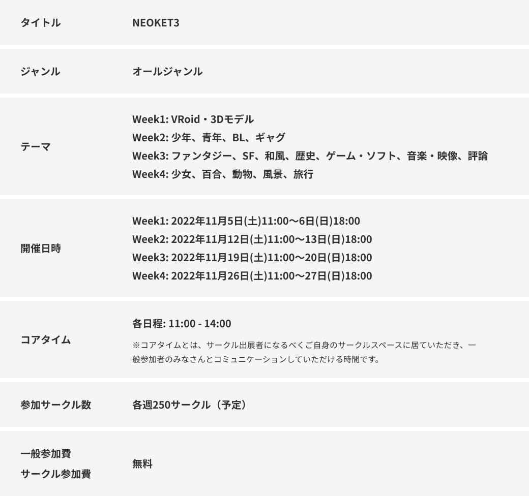 ピクシブ株式会社(本社:東京都渋谷区、代表取締役:國枝信吾、以下ピクシブ)は、オンライン即売会「NEOKET3(ネオケットスリー)」を2022年11月5日(土)〜11月27日(日)の期間の土日限定でテーマ別に4週連続開催します。7月8日(金)より、出展サークル応募が開始になりました。NEOKET3公式サイトよりお申込いただけます。