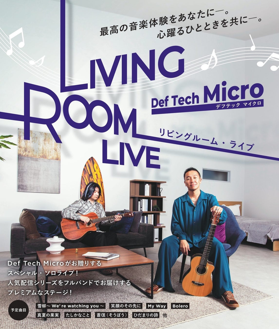 自身のYouTubeチャンネル「Def Tech Micro’s Lifestyling.」にて、往年の名曲を独自のアレンジで披露する人気シリーズ「LIVING ROOM LIVE」をステージに再現し、国内外で活躍するサポートメンバーと共に豪華フルバンド編成でお届けいたします。