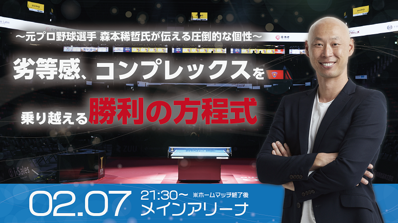 2月7日(月)ホームマッチ終了後21:30(予定)から開催するのは、元プロ野球選手・森本稀哲(ひちょり)さんをゲストにお招きしたスペシャルトークショー。「劣等感、コンプレックスを乗り越える勝利の方程式~元プロ野球選手 森本稀哲氏が伝える圧倒的な個性~」と題して、トッププレーヤーに上り詰めるまでの苦悩の日々や向き合いかたや目標設定の方法・手法などさまざまな経験をしてきた森本稀哲さんと琉球アスティーダ代表の早川周作が対談いたします。