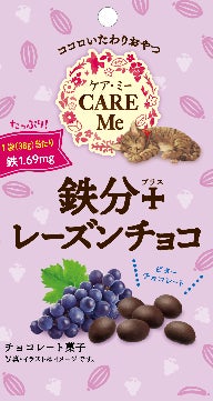 商品特徴:レーズンをほろ苦いビターチョコレートでコーティングしました。レーズンの爽やかな甘さとビターチョコレートのほろ苦い味わいが絶妙にマッチしています。1袋当たり約1.69㎎の鉄分を配合