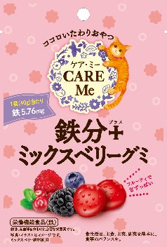 商品特徴:いちご型のミックスベリー味のグミ。口いっぱいにミックスベリーのフルーティーで甘酸っぱい風味が広がります。1袋当たり5.76㎎の鉄分を配合した栄養機能食品です。