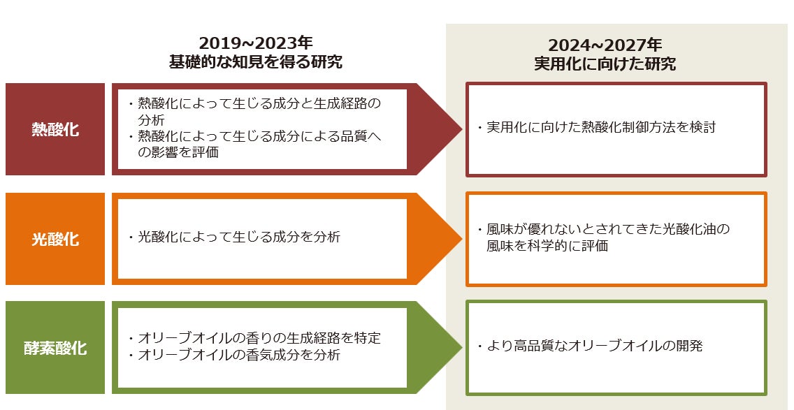 今回、共同研究講座を3年間延長することによって、油脂の酸化に関するさらなる基礎データ収集を進めるとともに、これまで得られた熱・光による油脂の酸化に関する知見やオリーブオイルの風味に関する知見を基に、油脂のおいしさや健康価値の創造に向けて、応用研究を展開していきます。
