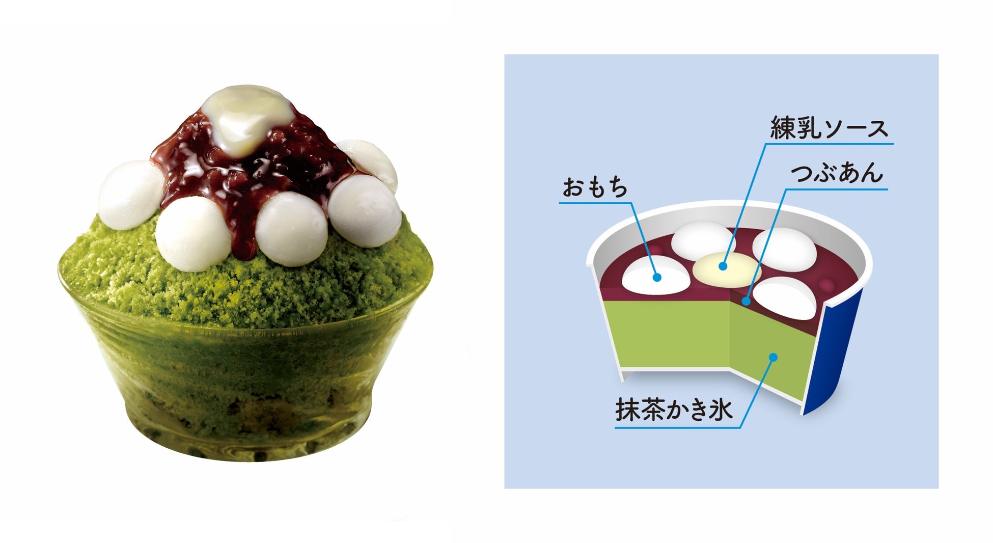 自社で炊き上げたあずきの風味が詰まったつぶあんと、北海道産練乳を配合した練乳ソースのトッピングが抹茶氷の旨み・ほろ苦さと絶妙にマッチします。