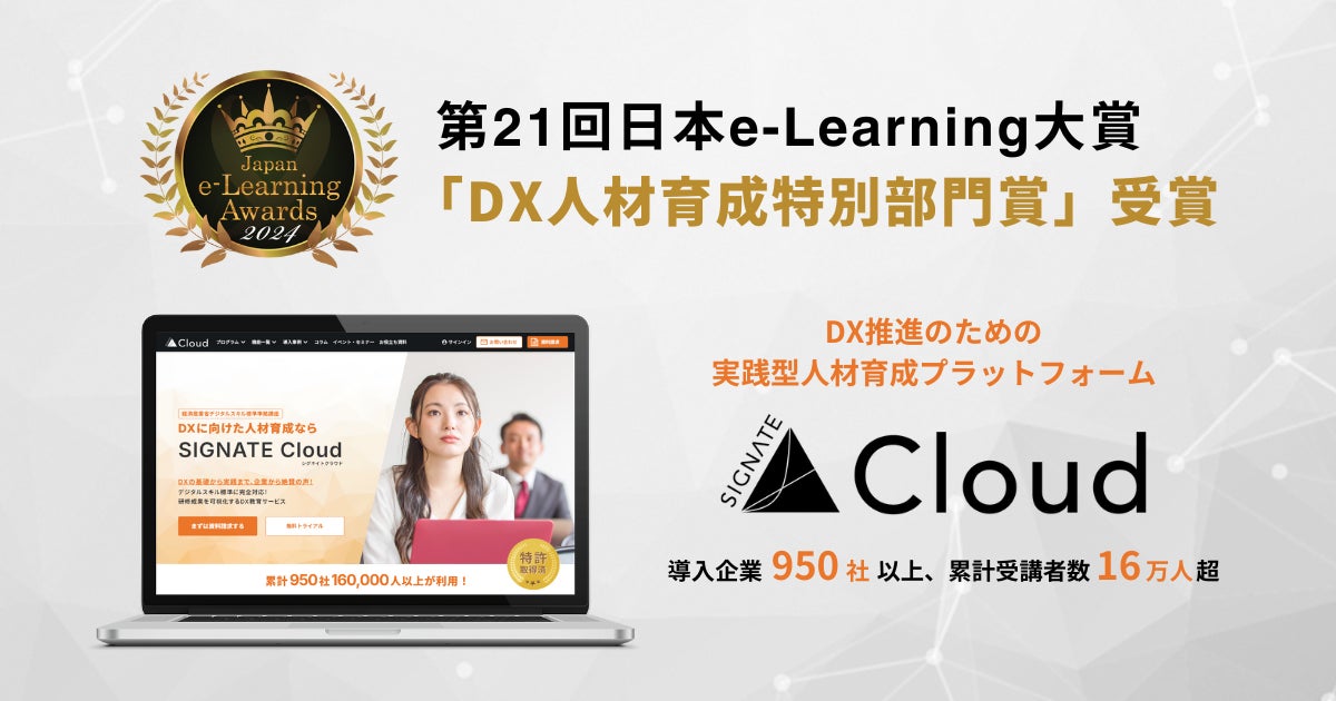 企業のDX推進を支援する株式会社SIGNATE(本社:東京都港区、代表取締役社長:齊藤 秀、以下「SIGNATE」)は、自社で開発・提供するDX推進のための実践型人材育成プラットフォーム『SIGNATE Cloud』が、第21回日本e-Learning大賞において「DX人材育成特別部門賞」を受賞したことをお知らせいたします。