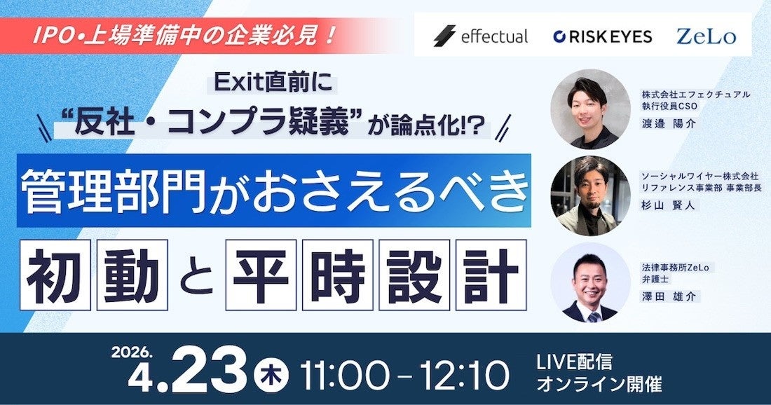 株式会社エフェクチュアル(本社:東京都港区、代表取締役:田中倫明)は、IPO・上場準備中の企業の管理部門を対象に、反社チェック・コンプライアンス対応をテーマとしたオンラインウェビナー「Exit直前に"反社・コンプラ疑義"が論点化!? 管理部門がおさえるべき初動と平時設計」を2026年4月23日(木)11:00より開催いたします。参加費は無料です。本セミナーでは、ソーシャルワイヤー株式会社、法律事務所ZeLoと共に、Exit直前に発生しやすい反社・コンプライアンス上の懸念とその実務対応について解説します。