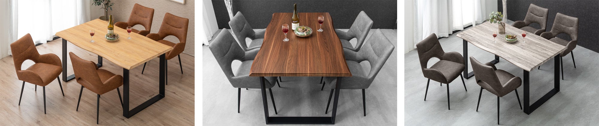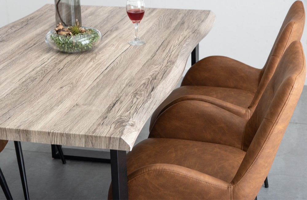 オートリターンチェア4脚となぐり加工が施された立体感のある美しいダイニングテーブルとのセットも発売いたしました。セットのテーブルは3.5cmの極厚天板が生み出す重厚感が特徴となっております。また、テーブル両端のなぐり加工と本物のような木目を表現したエンボス加工により、リアルな木の質感を再現しています。