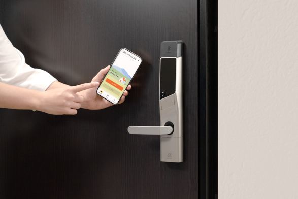 ナミキが管理する物件のエントランスおよび、各住戸ドアにスマートロックを設置します。入居者は、登録済みのメールアドレス宛に届く案内に沿って「homehub」のスマホアプリ内で、ICカードや暗証番号など、希望する解錠手段を登録することで鍵として利用できます。