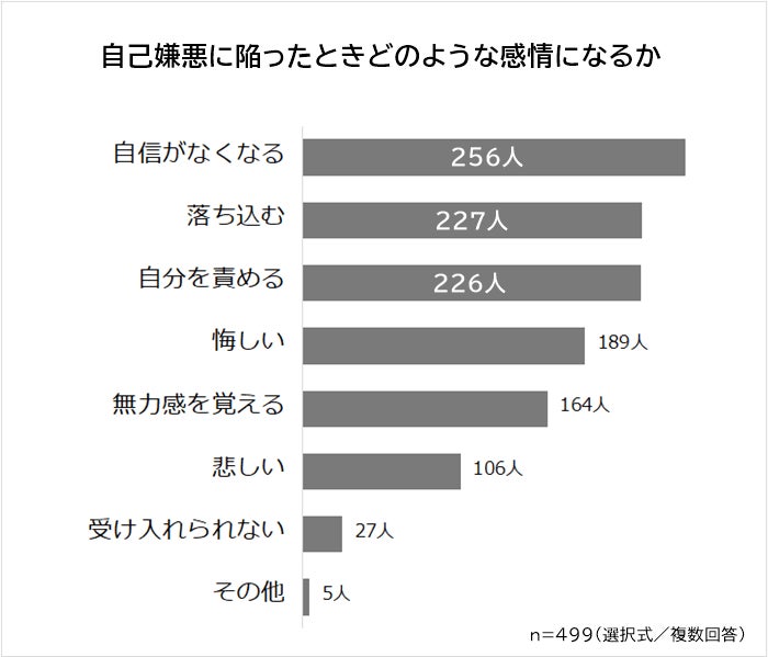 次に、仕事で自己嫌悪に陥るとどのような感情になるかを聞いたところ、「自信がなくなる」「落ち込む」「自分を責める」と答えた人が多数を占めました。自分で自分がイヤになってしまうと、落ち込みますし自信がなくなるのも当然ですね。