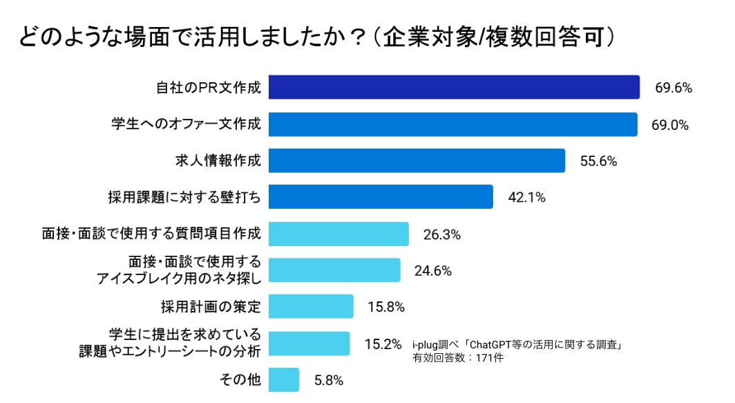 「自社のPR文作成(69.6%)」、「学生へのオファー文作成(69.0%)」が上位でした。4番目に多い項目として「採用課題に対する壁打ち(42.1%)」。文章の作成だけでなく、考えに対する壁打ちにも活用されていることがわかります。
