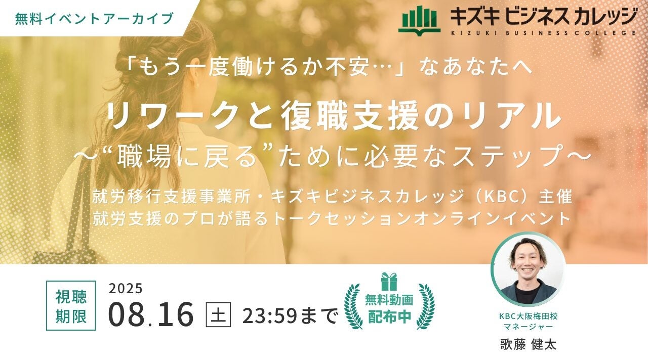 就労移行支援事業所・キズキビジネスカレッジ(KBC)が2025年7月10日(木)に開催した、復職に不安を抱える方に向けた無料オンライントークイベントのイベントアーカイブ動画を無料でプレゼントします。