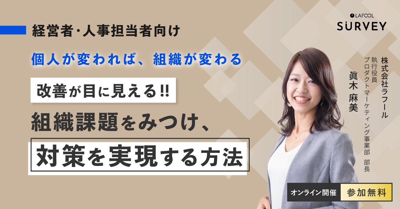 「個人が変われば、 組織が変わる」組織改善サーベイ「ラフールサーベイ」を提供するウェルビーイング/人的資本経営支援の株式会社ラフール(本社:東京都中央区、代表取締役社⻑:結木啓太、以下「ラフール」)は『個人が変われば、組織が変わる。本気で取り組む │ 改善が目に見える‼組織課題をみつけ、対策を実現する方法』をテーマとしたオンラインセミナーを2023年2月16日(木)に開催します。