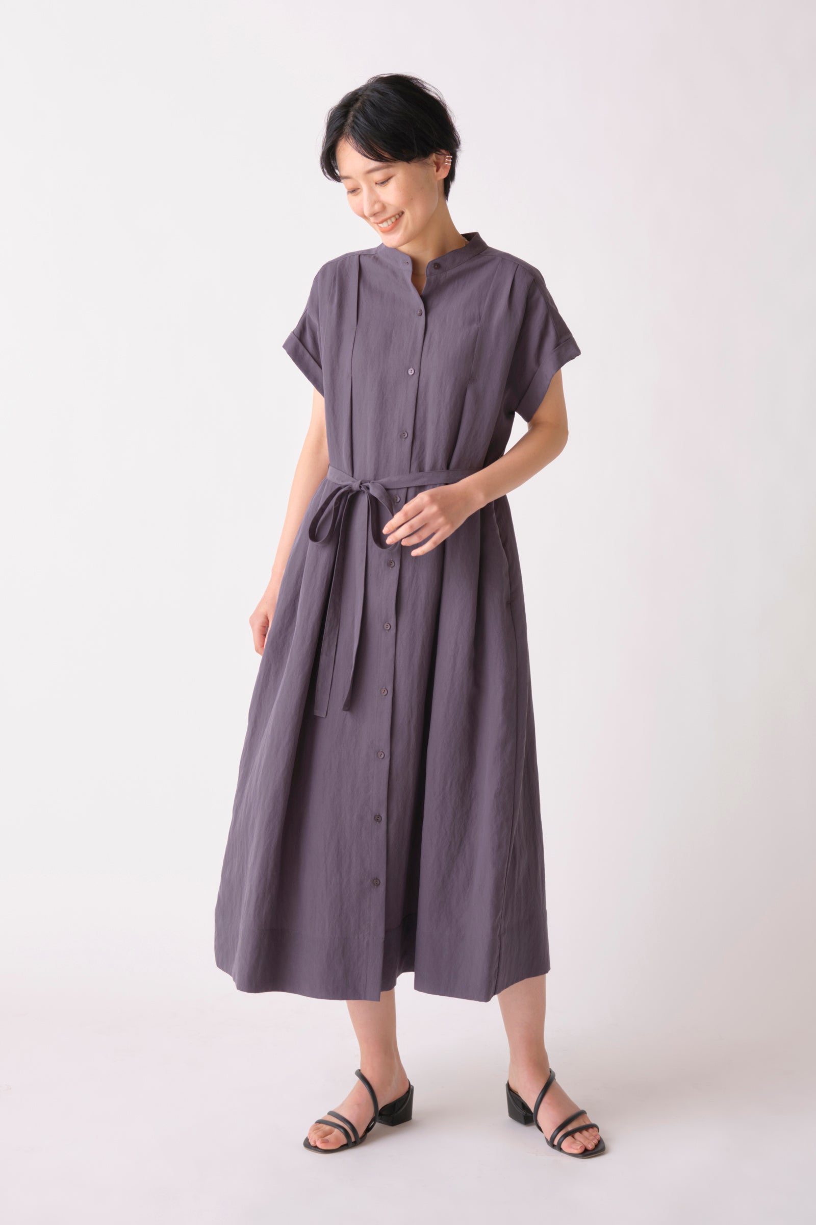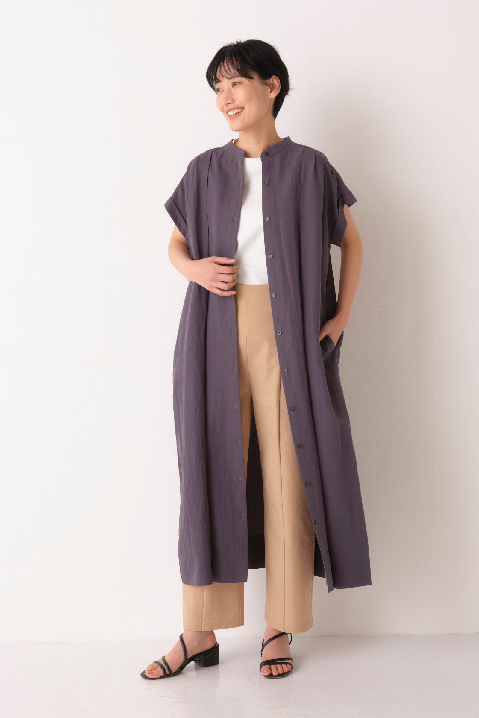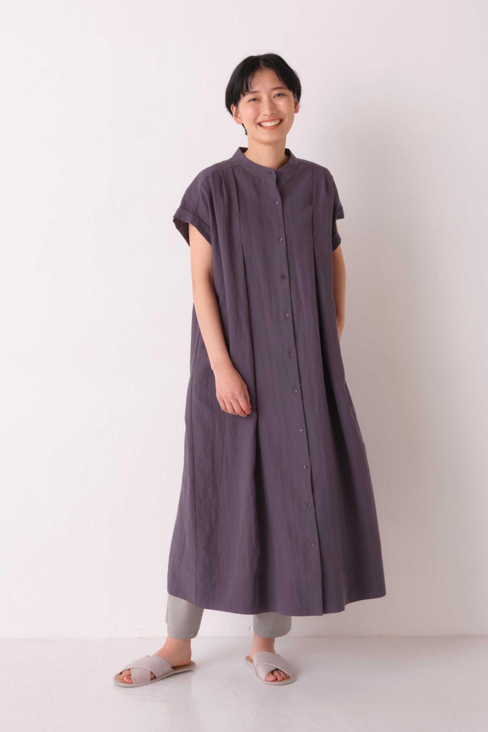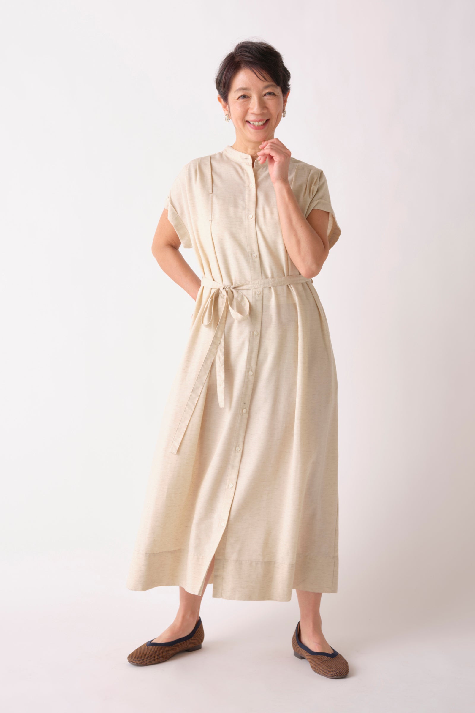 「暮らしに"効く"衣服」を目指すKEYUCAのアパレルラインらしく、付属の共布ひもでウエストマークしたり、羽織にしたりと着こなしのアレンジが可能で、ご自宅の洗濯機で洗えるイージーケア。麻混のさらりとした着心地に、こだわりのタックデザインでゆったりとしたシルエットでもシックに決まり、大人の女性の夏の装いに最適な1着です。