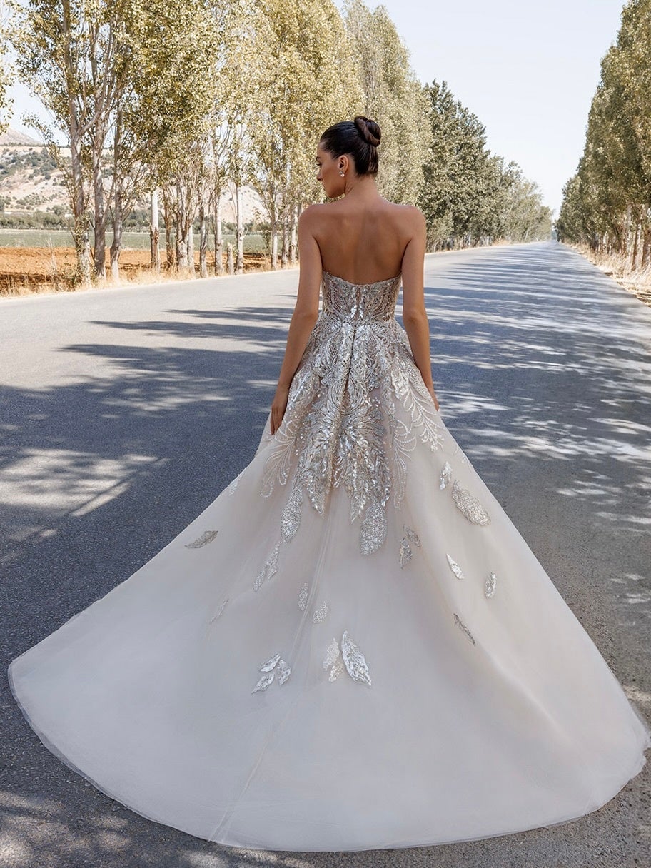 上質なファブリックとイリュージョンバックの美しさ、まるでジュエリーを身に纏っているかのような繊細で豪華な刺繍が特徴。