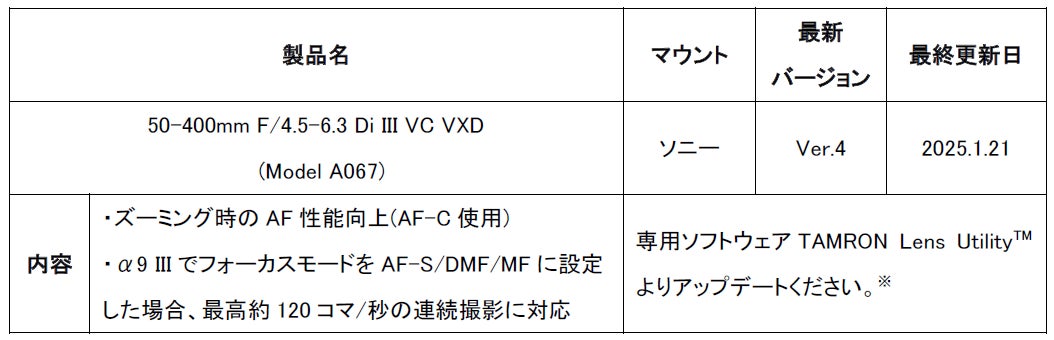 総合光学機器メーカーの株式会社タムロン(代表取締役社長:桜庭省吾、本社:さいたま市)は、タムロン「50-400mm F/4.5-6.3 Di III VC VXD (Model A067)」ソニー Eマウント用のレンズファームウェアがアップデートしますことをご案内申し上げます。