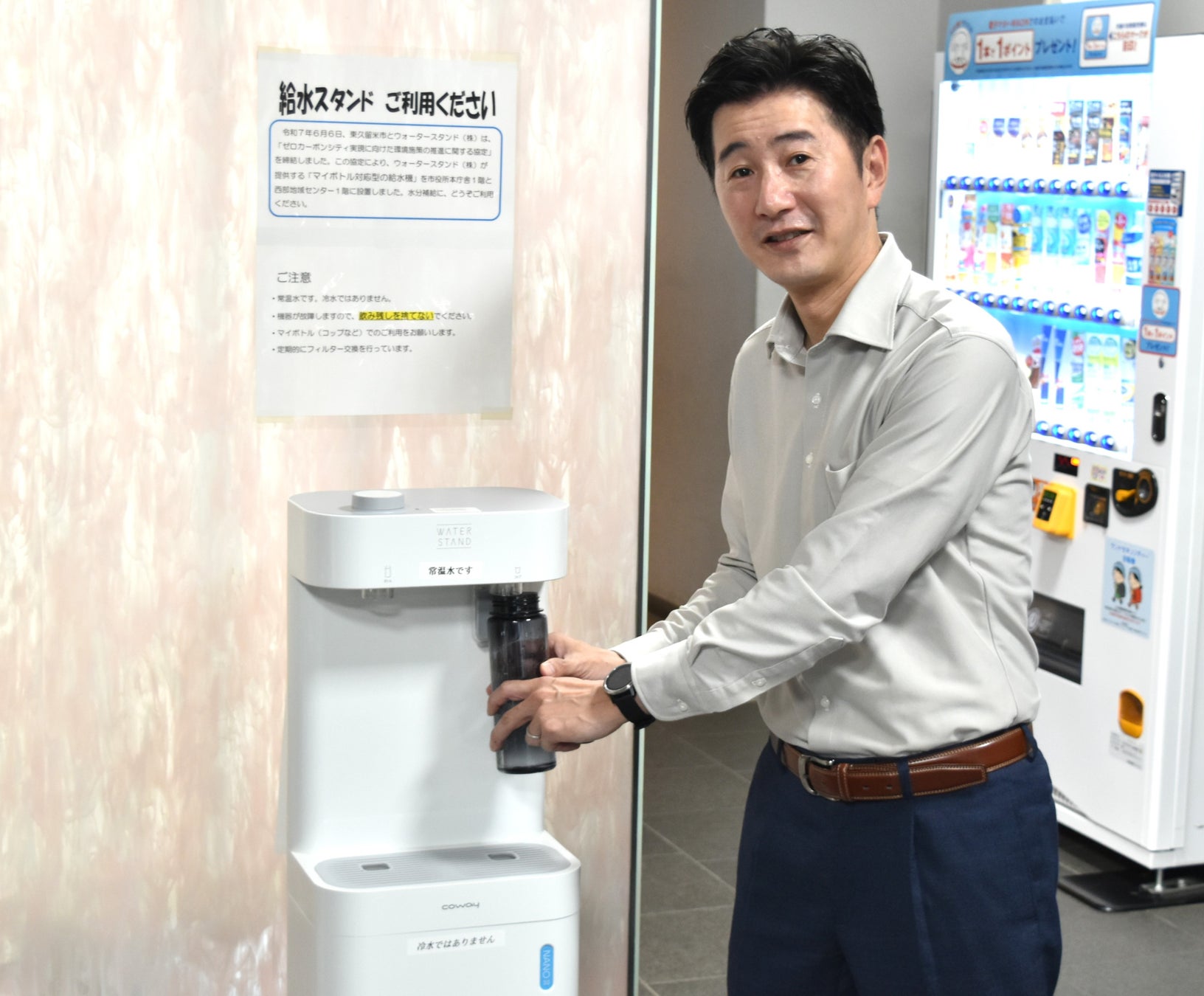 当社は使い捨てプラスチックボトル30億本の削減をミッションに掲げ、東久留米市を含め全国の地方公共団体・教育委員会と「ボトルフリープロジェクト」を推進しています。当社の「ボトルフリープロジェクト」は、誰もがアクセスできる水道水を活用し環境負荷が少ない給水スタンドを整備し、マイボトル活用を推進するものです。