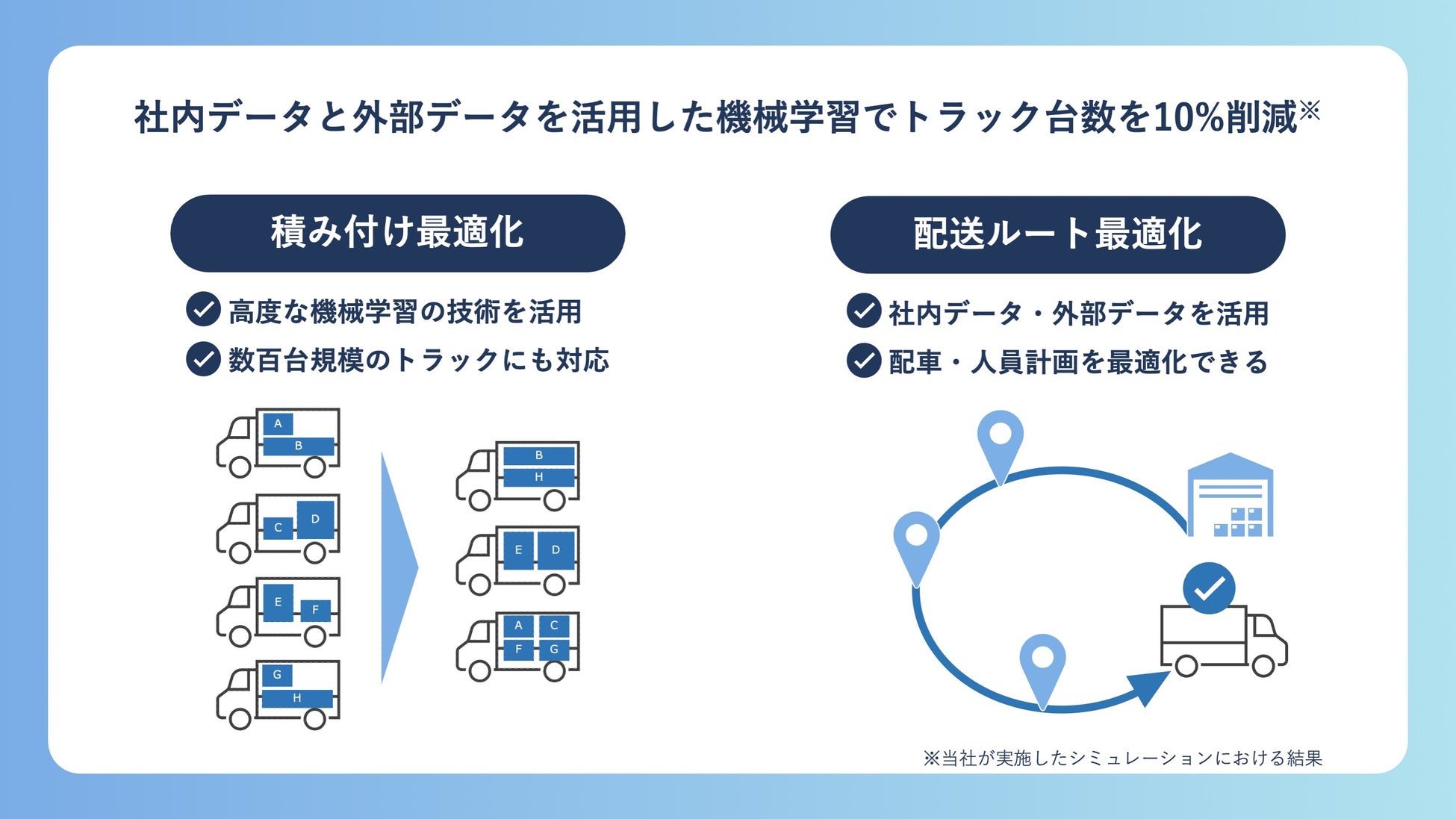 受発注データや商品マスタをもとに、高度な機械学習の技術で積み付けを最適化し、トラックの積載率を改善します。人力では対応できない数百台規模のトラックの積み付けを算出可能です。