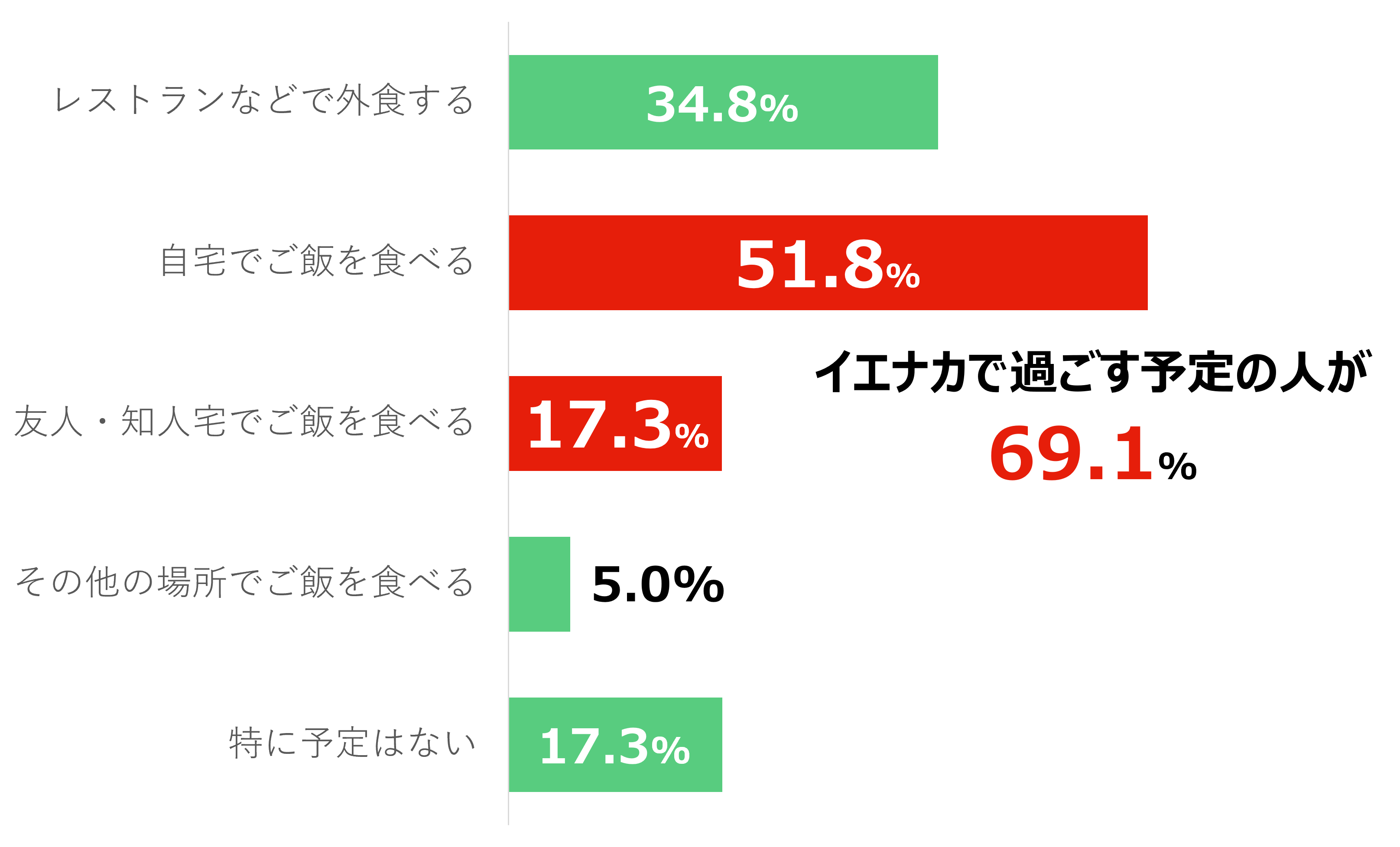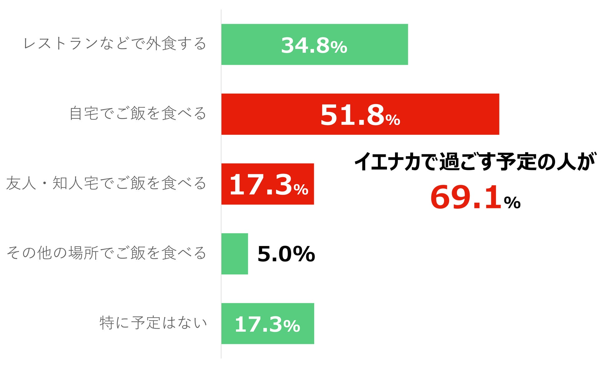 34.8%が外食すると回答する一方、自宅や友人宅などのイエナカで食べると回答した方は69.1%に。