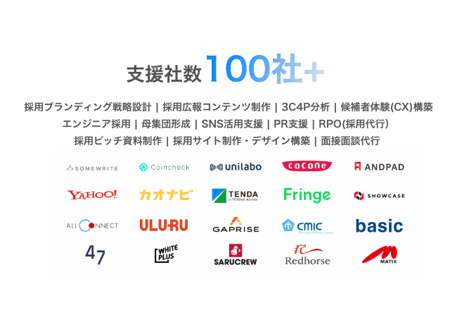 累計100社以上のご支援実績から成功パターンを抽出した「HeaRメソッド」を用いた採用コンサルティングを行っております。採用ブランディング戦略設計、候補者体験の構築、組織開発はもちろん、採用代行に至るまで一気通貫のご支援が可能です。