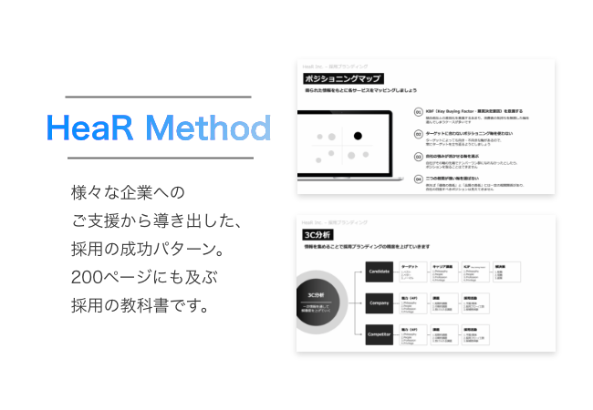 2年に渡って累計100社以上の採用コンサルティングを行った経験を踏まえ、現在HeaRでは「これまでの採用の常識」をアップデートするメソッドを制作しています。採用ピッチ資料の制作と普及を牽引し、採用ブランディングにおいても多くの企業にご期待いただいているHeaRだからこそ、そのメソッドへの注目も集めています。HeaRメソッドを元にした採用に関するホワイトペーパーは、年間約3000人の方にダウンロードいただき、ご好評を賜っています。