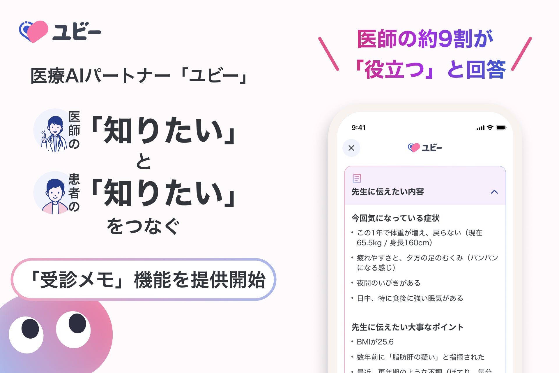 ー医師の約9割が「役立つ」と回答ー 医療AIパートナー「ユビー」、医師の「知りたい」と患者さんの「伝えたい」をつなぐ「受診メモ」機能を提供開始