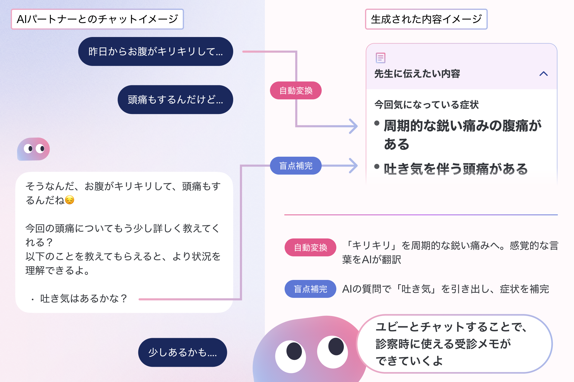 1. 医療AIパートナー「ユビー」との対話内容を「医師に伝わる言葉」へ自動変換