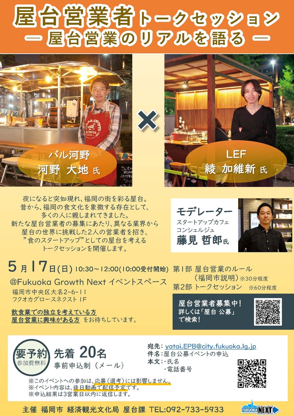 これから屋台営業を始めたい方や、屋台営業に関心のある方を対象に、公募により屋台を始めた営業者によるトークセッションを行います。屋台営業の魅力ややりがいに加え、開業準備や日々の営業での苦労、工夫など、実体験をご紹介します。