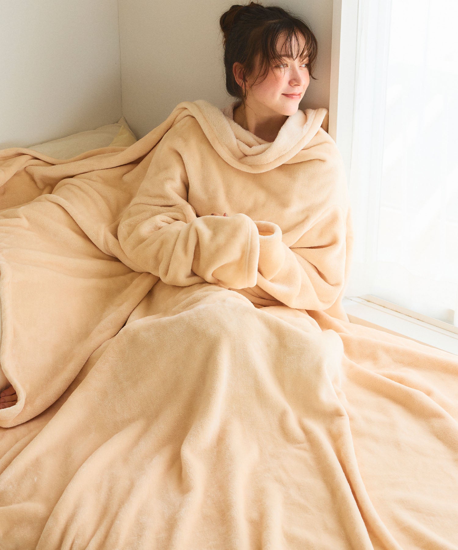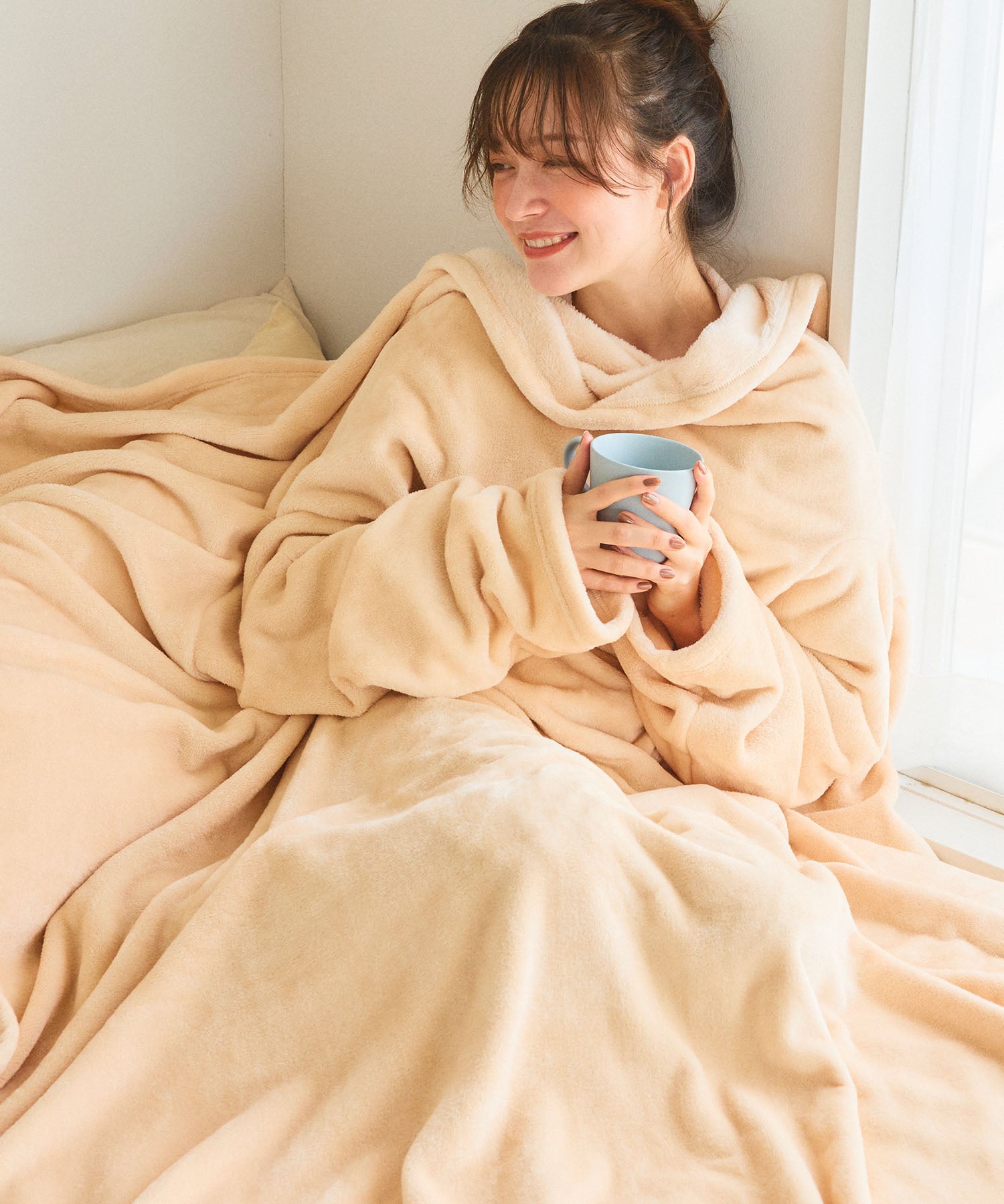 前から袖を通すタイプの袖付き毛布です。スマホやゲーム、デスクワークなど、毛布に包まれて全身で温まりながら、作業をすることもできます。着るだけでなくブランケットやクッションとしても使用することができる優れものです。