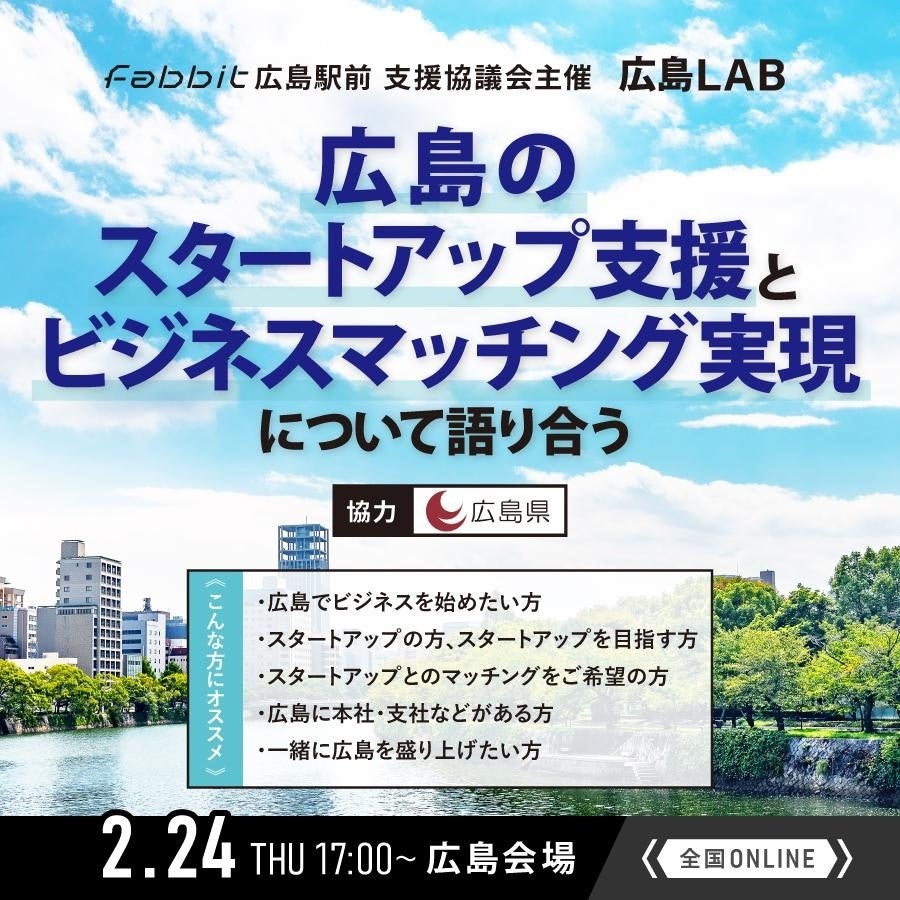 【イベント情報】fabbit広島駅前支援協議会主催・広島県協力、「広島LAB~広島のスタートアップ支援とビジネスマッチング実現について語り合う~」を2月24日にオンライン開催