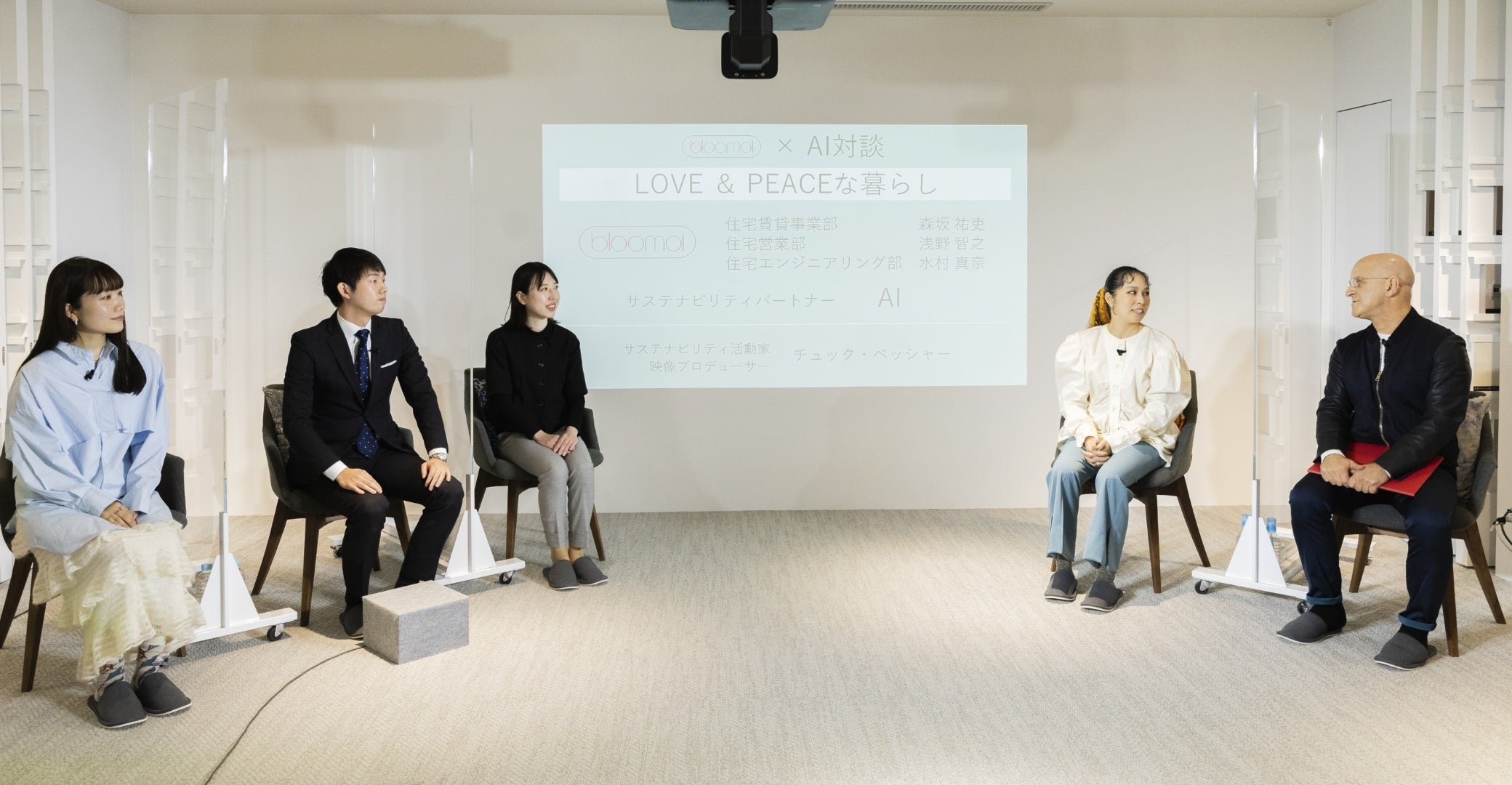 イベント当日は、ゲストに東京建物サステナビリティパートナーのAIさん、モデレーターとしてサステナビリティ活動家・映画プロデューサーのチュック・ベッシャーさんを招き、東京建物からはbloomoiプロジェクトに携わる社員3名が参加しました。bloomoiが大切にする「対話」と「共創」を紐解きながら、「LOVE & PEACEな暮らしとは何か」をテーマにトークセッションを実施しました。