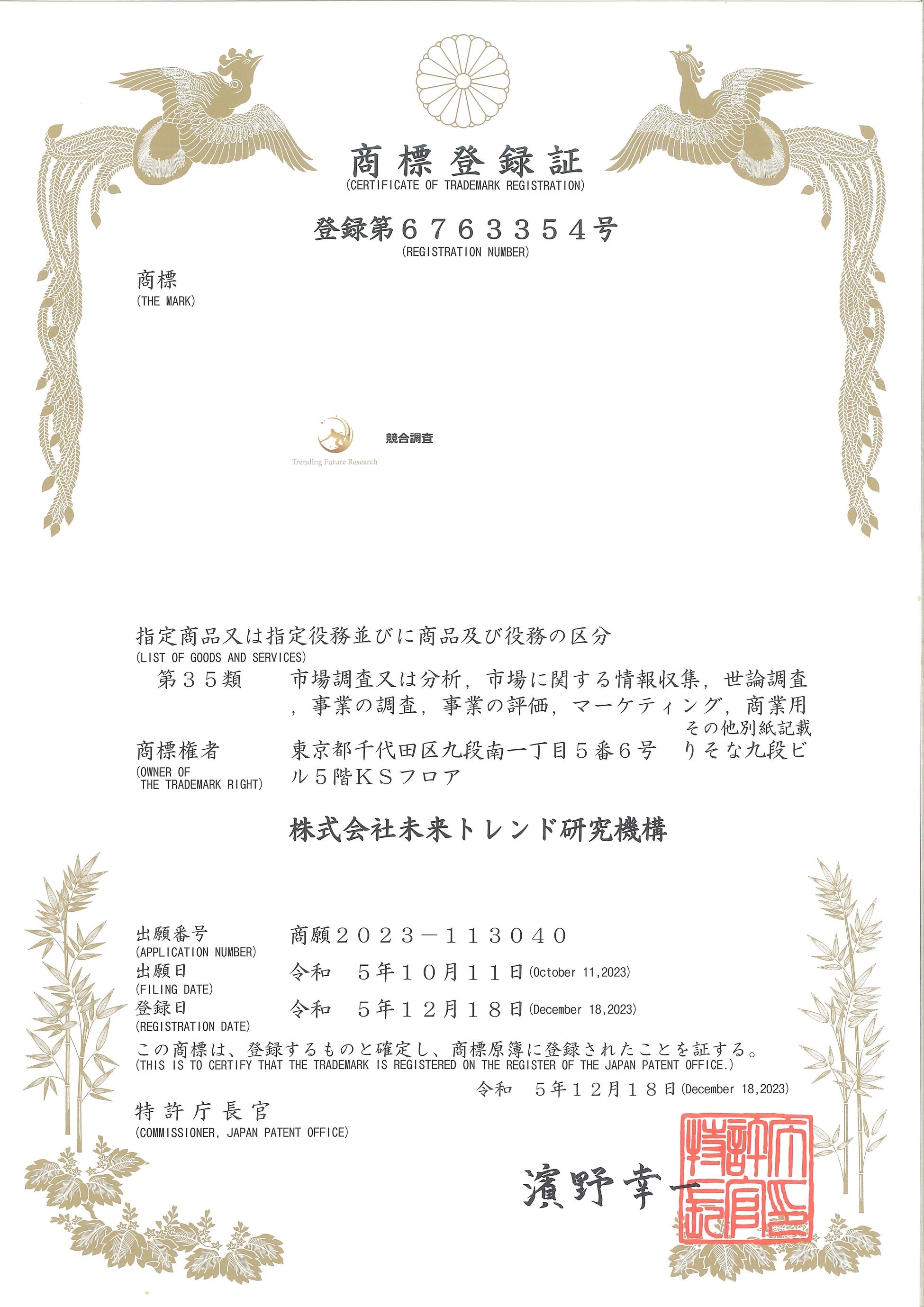 「競合調査」 に関する 商標登録 のお知らせ 「競合調査」Ⓡ<商標登録 第6763354号>