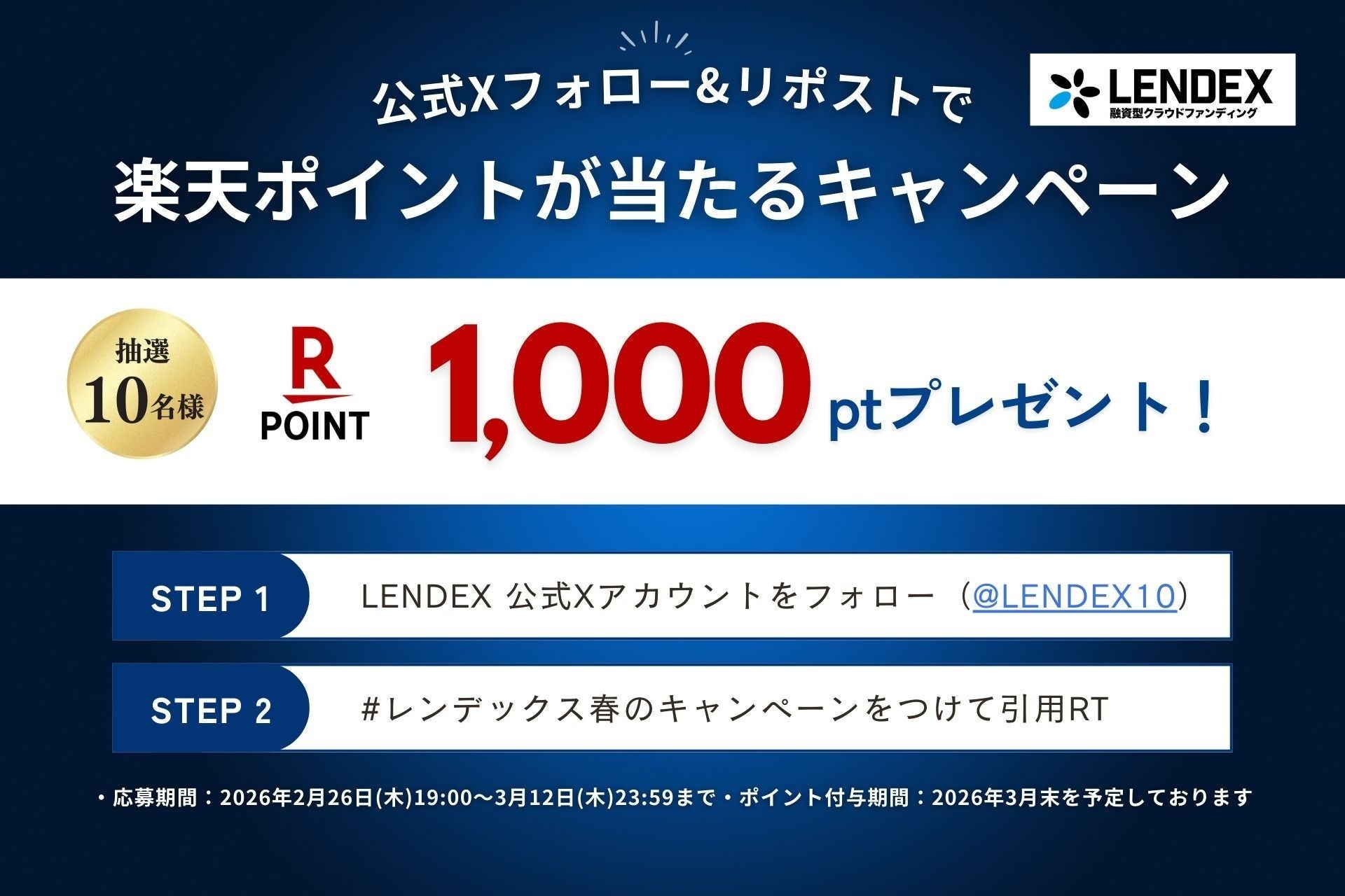 この度、融資型クラウドファンディング「レンデックス(LENDEX)」を運営する株式会社LENDEX(本社:東京都渋谷区、代表取締役:中村 智)は、この春、より多くの方にレンデックスを知っていただく機会として、本日2月26日(木)より「公式Xフォロー&リポストキャンペーン」を開催いたします。
