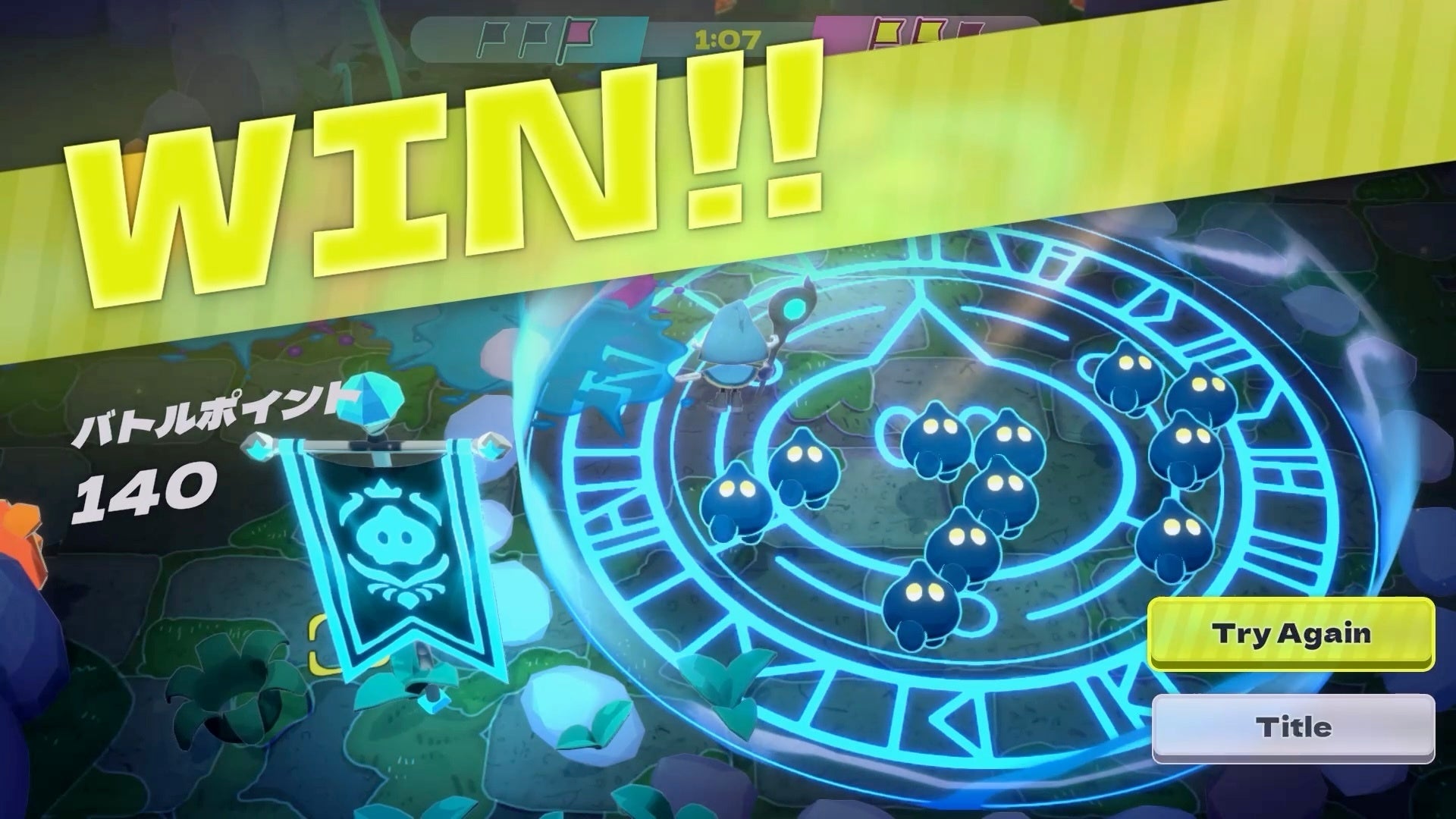 スライムを召喚して増やし、マップ上に配置された旗を4つ回収するか、相手陣の旗を回収すると勝利のシンプルルール。時には正面から、時には背後からとうまく立ち振る舞い、相手にバレないようにこっそり大旗を運んで一発逆転!
