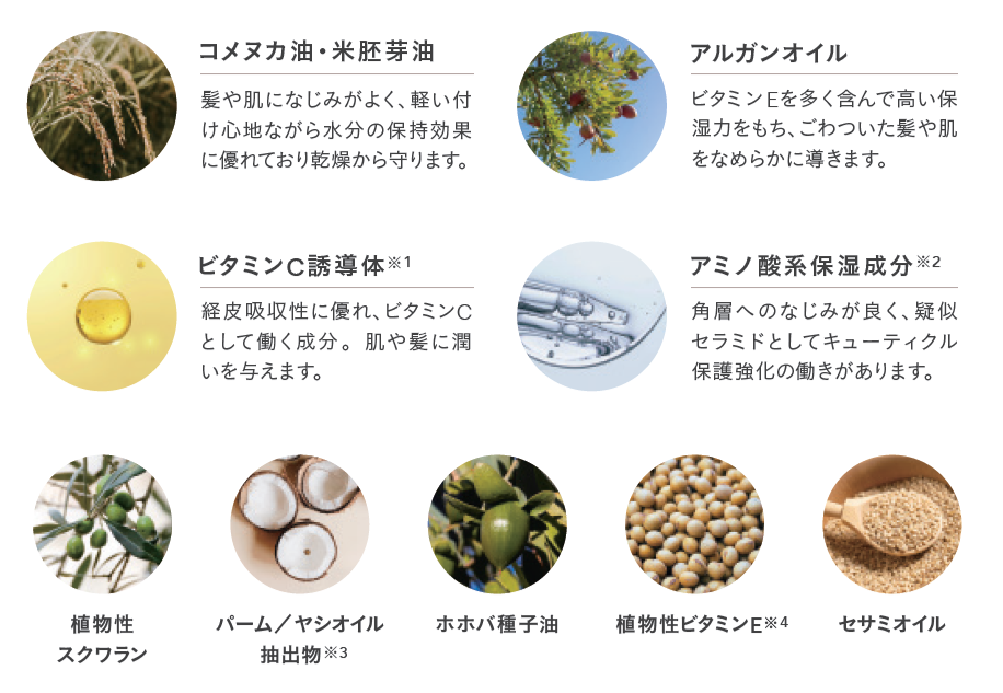 髪や肌にすっとなじむ浸透性にすぐれたオイルと美容成分を厳選。