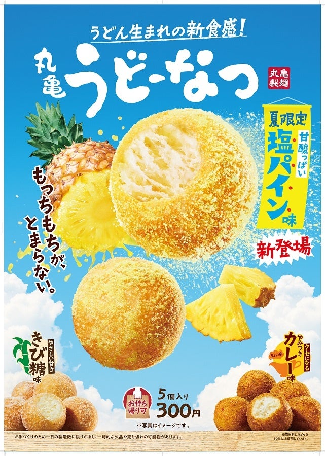 夏も、もっちもちがとまらない!うどん生まれの今までにない衝撃のもっちもち食感!累計販売数3週間で300万食突破の「丸亀うどーなつ」から夏限定!甘酸っぱい『丸亀うどーなつ 塩パイン味』登場