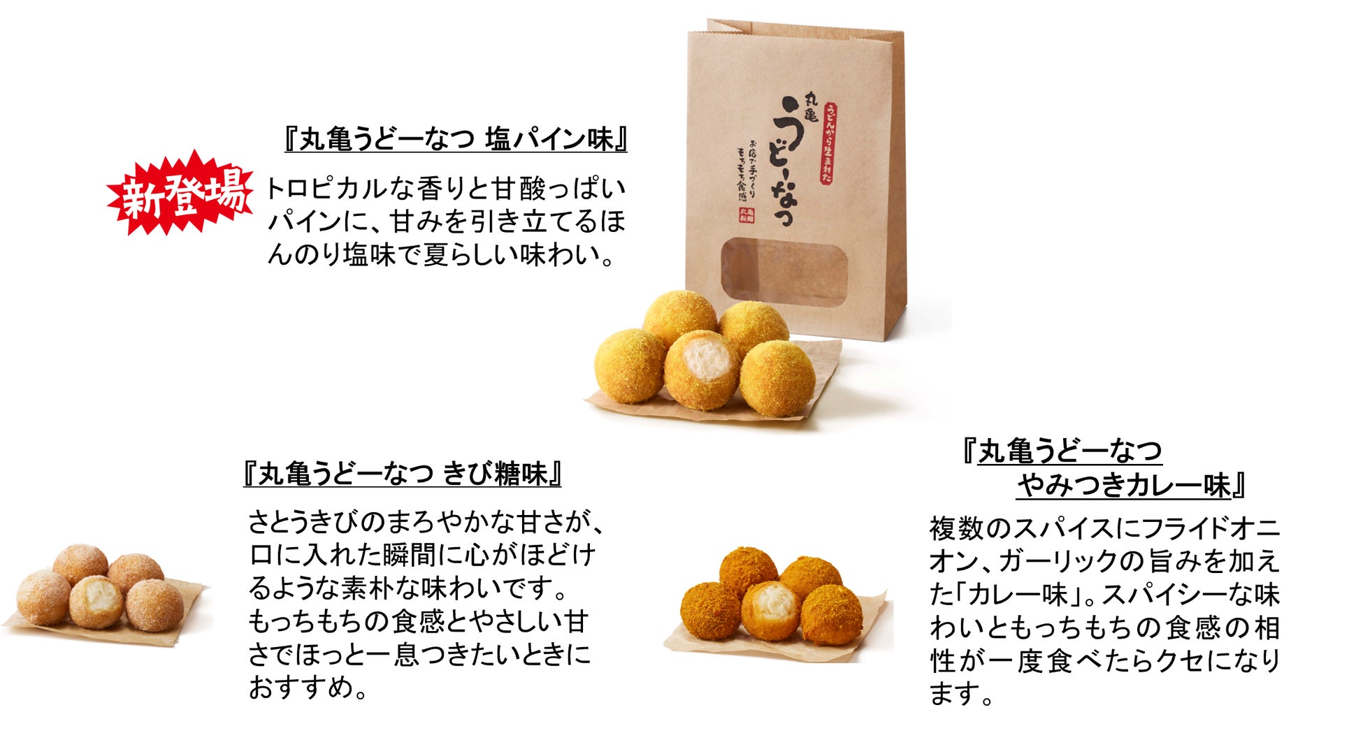 この夏は、大好評販売中のやさしい甘さの『丸亀うどーなつ きび糖味』、スパイシーさがクセになる『丸亀うどーなつ やみつきカレー味』、新登場の『丸亀うどーなつ 塩パイン味』の3種類を展開します。お一人でも、ご友人やご家族と味わいを交換して楽しんでいただくのもおすすめです。