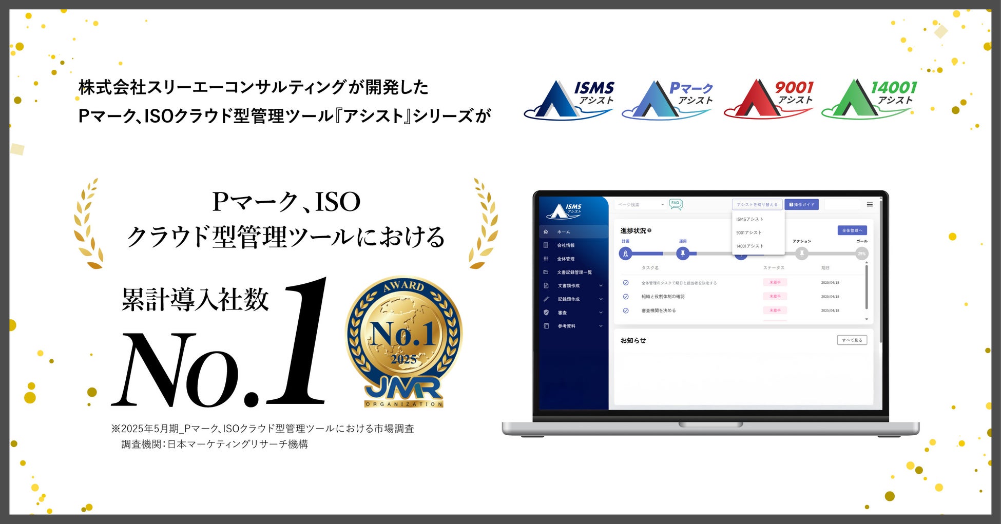Pマーク、 ISOコンサルにおける支援実績 No.1(注1)のISO/Pマークの取得・運用支援サービス「認証パートナー」を提供する株式会社スリーエーコンサルティング(本社:大阪府大阪市、代表取締役社長:竹嶋 寛人)は、一般社団法人日本マーケティングリサーチ機構が実施した2025年5月の市場調査において、Pマーク、ISOクラウド型管理ツール『Pマークアシスト』『ISMSアシスト』『9001アシスト』『14001アシスト』が「Pマーク、 ISOクラウド型管理ツールにおける累計導入社数No.1」(注2)として認定されたことをお知らせいたします。