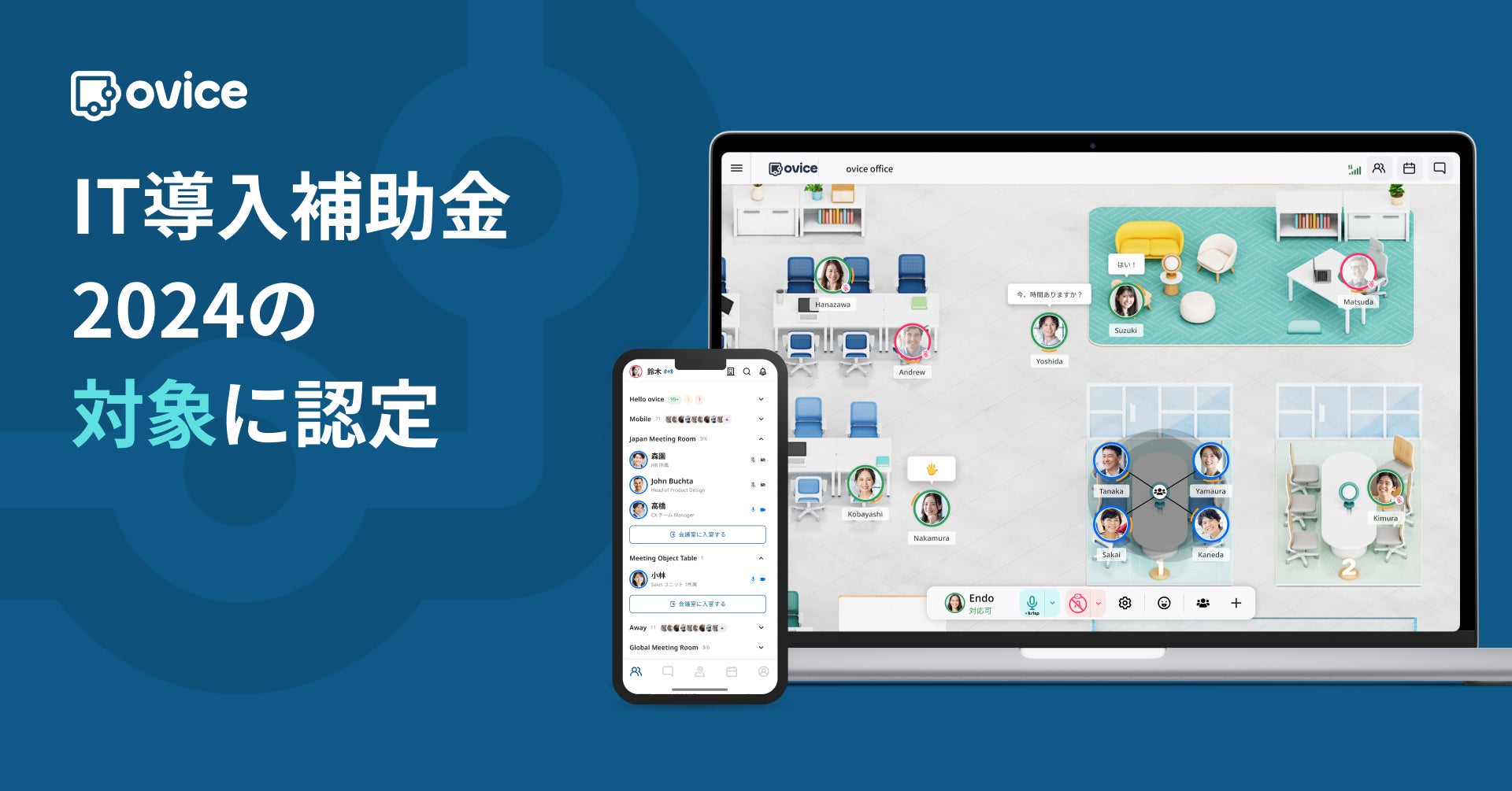 oVice株式会社(本社:石川県七尾市、代表取締役CEO:ジョン・セーヒョン)は、当社が開発・提供する、誰もが、どこからでも“つながる”バーチャルオフィス「ovice(オヴィス)」が、経済産業省が推進する「IT導入補助金2024」の対象として認定されたことをお知らせします。