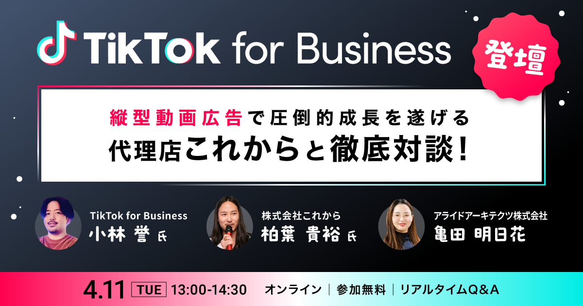 そこで今回は、TikTok for Businessの小林様とTikTok・Pangle等トレンド広告媒体にて月数億円規模での広告運用を行う株式会社これからの柏葉様をお迎えし、最新の広告媒体傾向から立ち上げ~継続的に成果を出すことに成功した制作・運用手法についてご紹介いたします。 今後の広告運用業務・事業運営でご参考いただける内容となっておりますので、ぜひご参加ください。