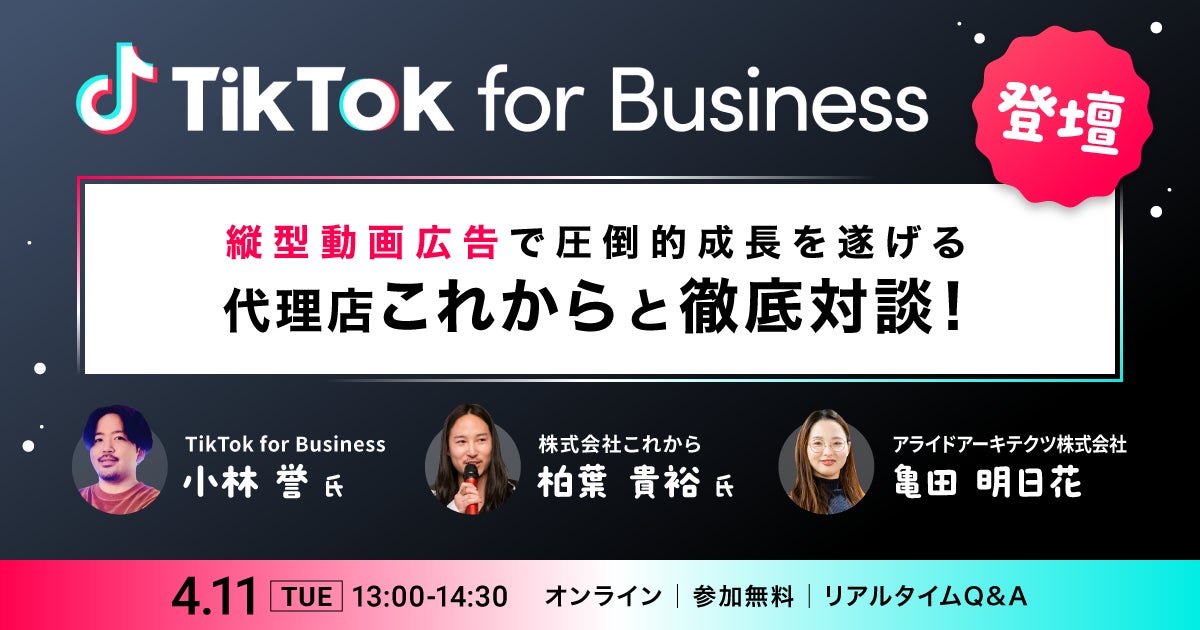 企業のマーケティングDXを支援するアライドアーキテクツ株式会社(東京都渋谷区、代表取締役社長 CEO:中村壮秀、証券コード:6081)でSaaS事業を展開するプロダクトカンパニー(プレジデント:村岡弥真人)が提供する「運用型制作(※1)」特化型動画制作支援サービス「LetroStudio(レトロスタジオ)」は、TikTok for BusinessとEC事業主に対する売上拡大支援を行う株式会社これからをゲストに迎え「制作・運用に縦型動画広告で圧倒的成長を遂げる制作・運用手法とは」をテーマに、TikTok広告・Pangle広告の制作・運用手法について解説するWEBセミナーを4月11日(火)に開催します。