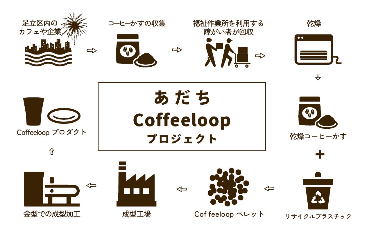 「あだちCoffeeloopプロジェクト」は足立区環境部環境政策課計画推進係との連携し、区内のカフェなどから出たコーヒーかすを回収し「あだちCoffeeloopプロジェクト」オリジナルデザインの「森のマイボトル Coffeeloop」などを開発する取り組みです。原料となるコーヒーかすの回収は足立区内の福祉作業所に担っていただくことで、障がい者の方の多様な就労機会の創出にも貢献します。2月上旬から区内のカフェなどでカップの導入を順次開始します。今後、賛同するカフェや企業を募りながら、足立区内のサーキュラーエコノミーを構築し、持続可能な資源利用を推進します。