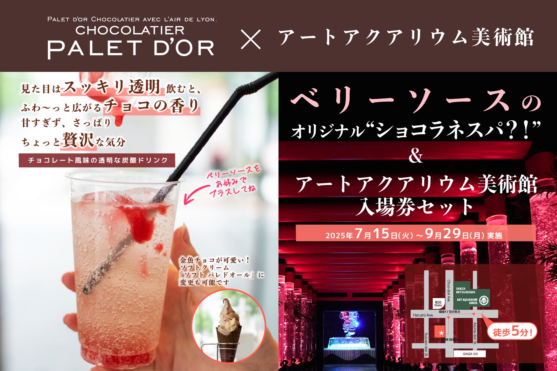 アートアクアリウム美術館 GINZA(所在地/銀座三越)では、2025年7月15日(火)~9月29日(月)までの期間にお楽しみいただける、ショコラティエ パレドオールの爽やかなオリジナルドリンクがセットになった限定入場券を販売いたします。
