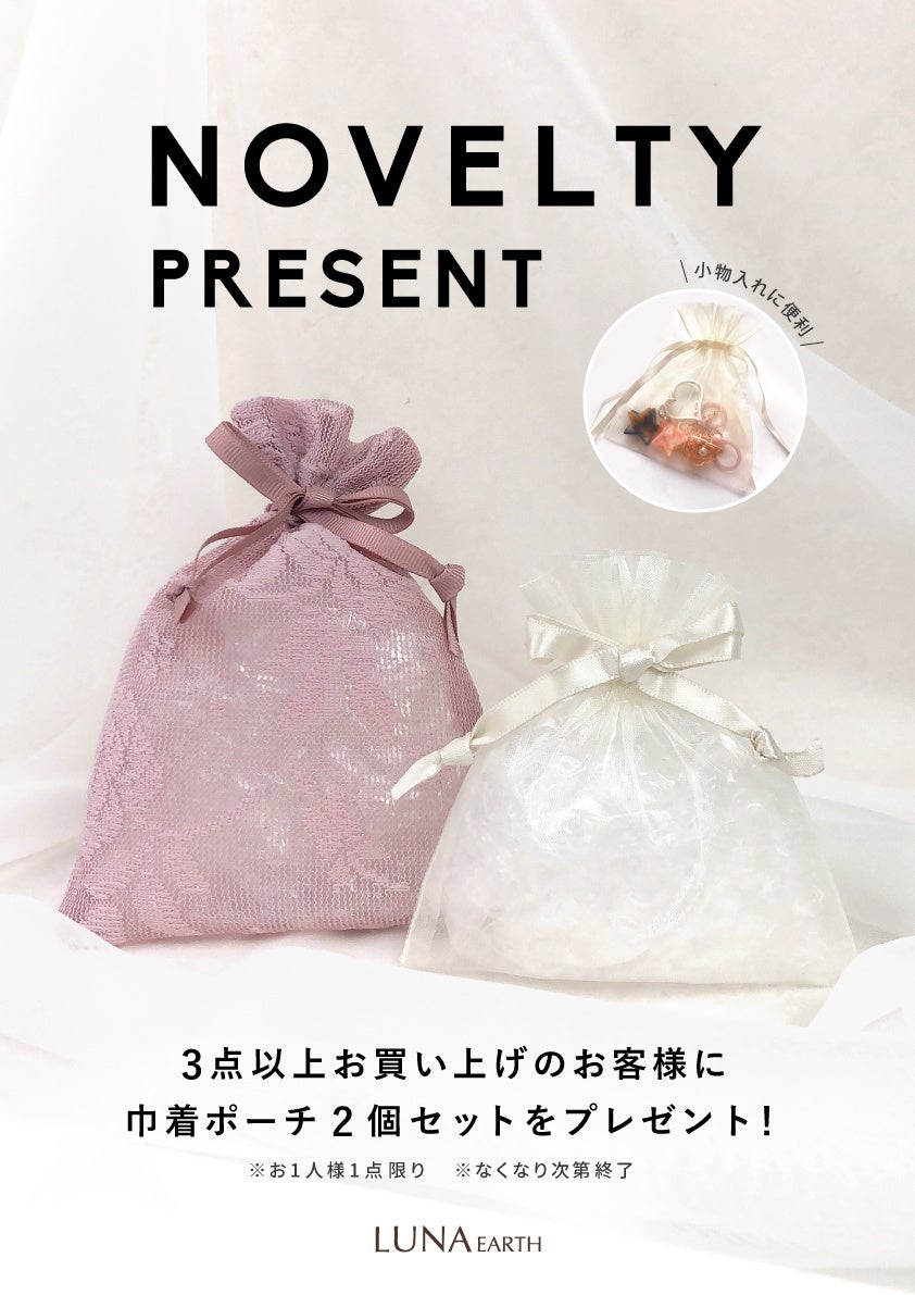 商品を3点以上のお買い上げのお客様に、アクセサリーの収納などに便利なレースの巾着ポーチ2個セットをプレゼントいたします。