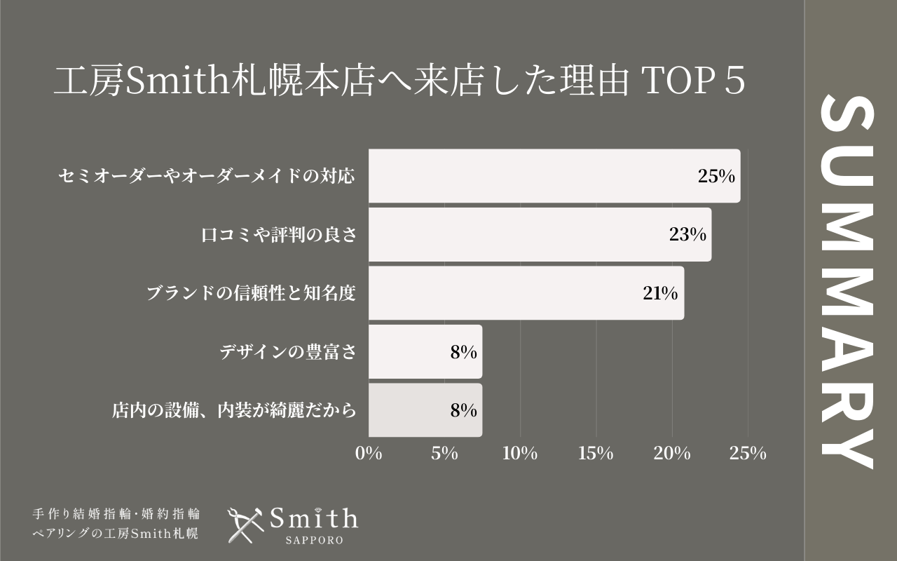 「デザインの豊富さ」や「店内の設備・内装が綺麗だから」といった項目もそれぞれ4%となっており、指輪づくりの体験そのものの質や空間の心地よさを重視されるお客様の存在も見られます。単なる「購入」ではなく、「特別な場所で、おふたりだけの特別なものを作り上げる」という工房Smith札幌本店ならではの魅力が、さまざまな想いを持ったお客様に届いた月となりました。