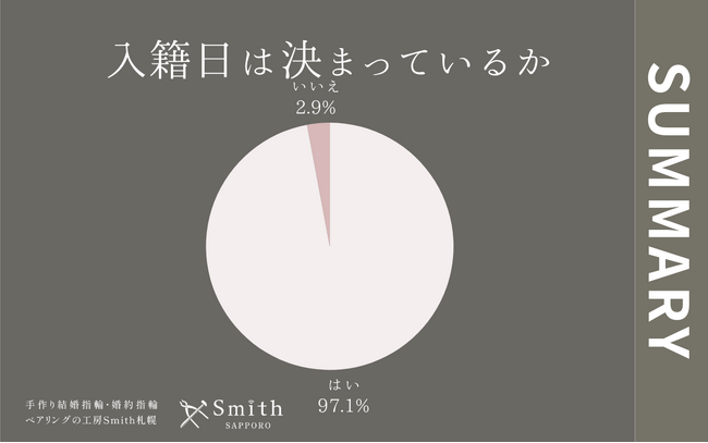 「入籍日は決まっているか」という質問に対し、「はい」と回答された方が97.1%と、ほぼすべてのカップル様がすでに入籍日を決めた状態でご来店されるという結果となりました。「いいえ」と答えられた方はわずか2.9%にとどまっています。