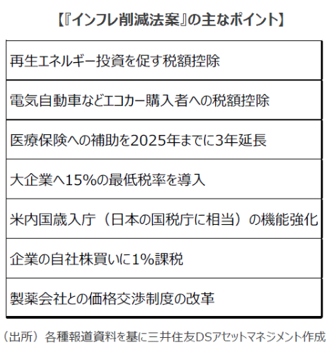 三井住友DSアセットマネジメント株式会社(代表取締役社長 兼 CEO:猿田隆)は、経済イベントや市場動向に関するマーケットレポートを日々発行しております。このたび、マーケットレポート「気候変動対策が目玉の『インフレ削減法案』が成立」を2022年8月17日に発行いたしましたので、お知らせいたします。